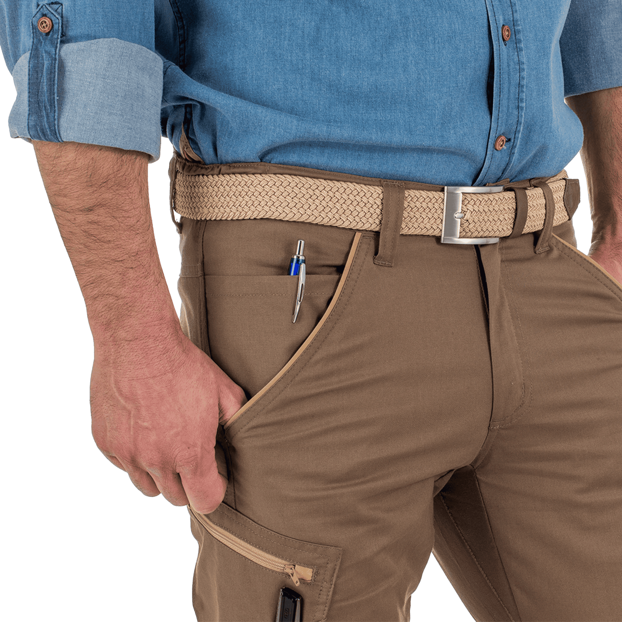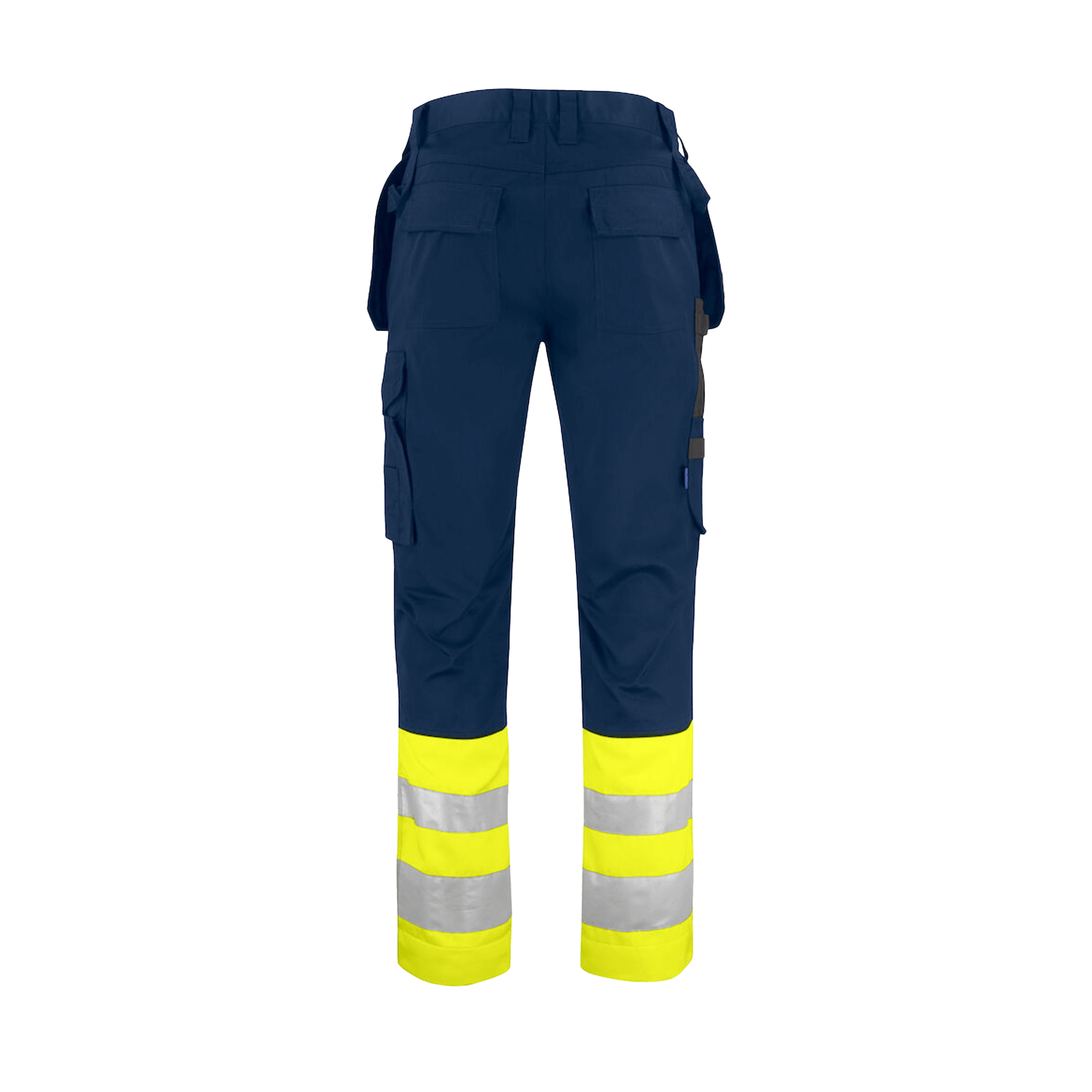 Hantverksbyxa med undanstoppningsbara hängfickor, den vänstra med extra fickor varav den ena försluts med dragkedja, på höger sida öppna fickor samt hållare för verktyg. Benfickor, på vänster sida ficka med övervidd samt telefonficka, försluts med kardborre. På höger sida tumstocksficka samt verktygsficka med knivknapp. Två hammarhankar, en på vardera sida. Bakfickor med lock, försluts med kardborre. Förstärkning i hängfickor, tumstocksfickan och över knäna för ökad slitstyrka. Förböjda knän med knäskyddsfickor som går att reglera i två höjder, öppning inifrån. C42-C64 kan förlängas med 5 cm genom ett utvik i benslutet.